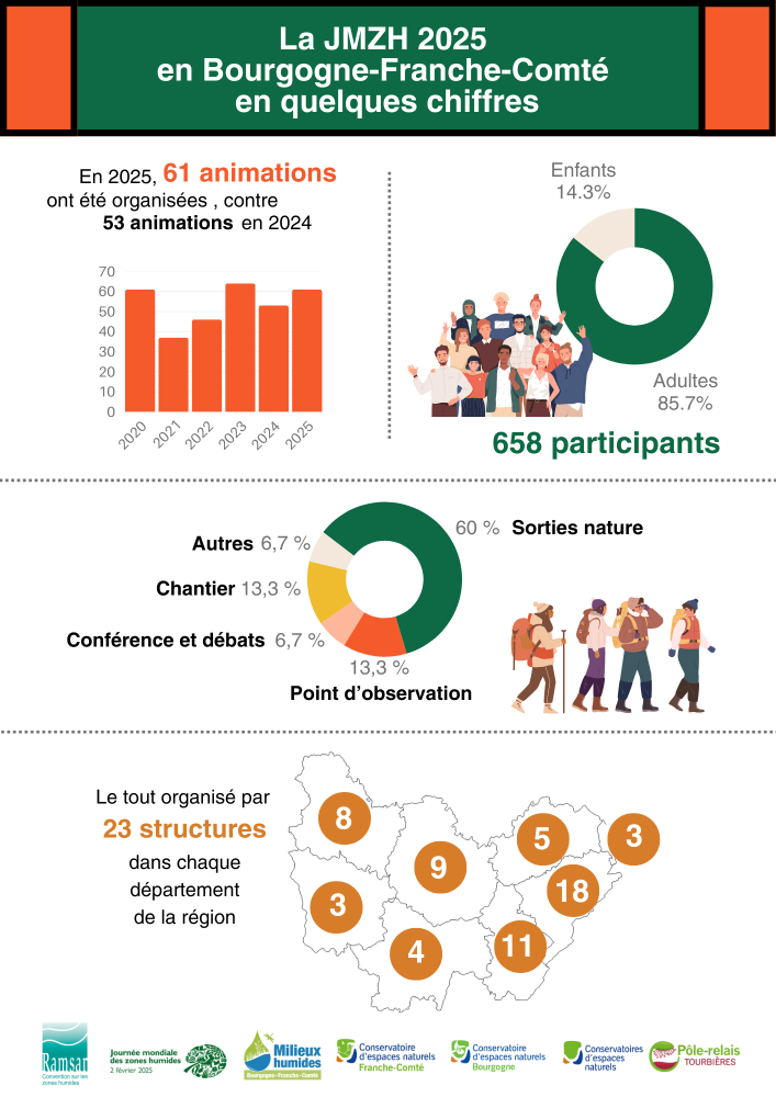 Le Pôle Milieux humides des Conservatoires d'espaces naturels Bourgogne et France-Comté a pris la relève du Pôle-relais Tourbières pour coordonner la JMZH dans la région Bourgogne France-Comté.