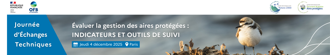 Les centres de ressources Natura 2000 et documents de gestion des aires protégées animés par l'OFB organisent une journée d'échanges techniques "Evaluer la gestion des aires protégées : indicateurs & outils de suivi" le 4 décembre 2025 à PARIS