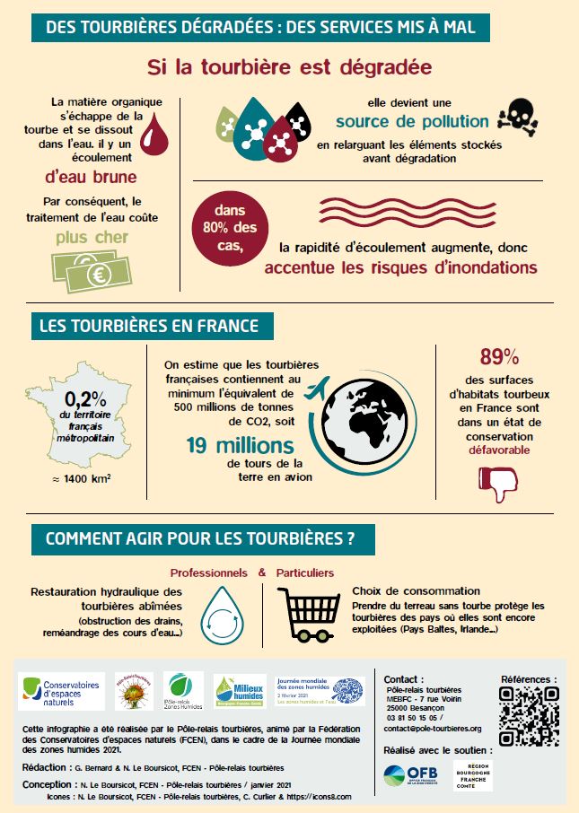 - une infographie sur le rôle des tourbières dans le cycle de l'eau et des vignettes présentant les 10 chiffres clé de l'évaluation nationale des sites humides emblématiques;